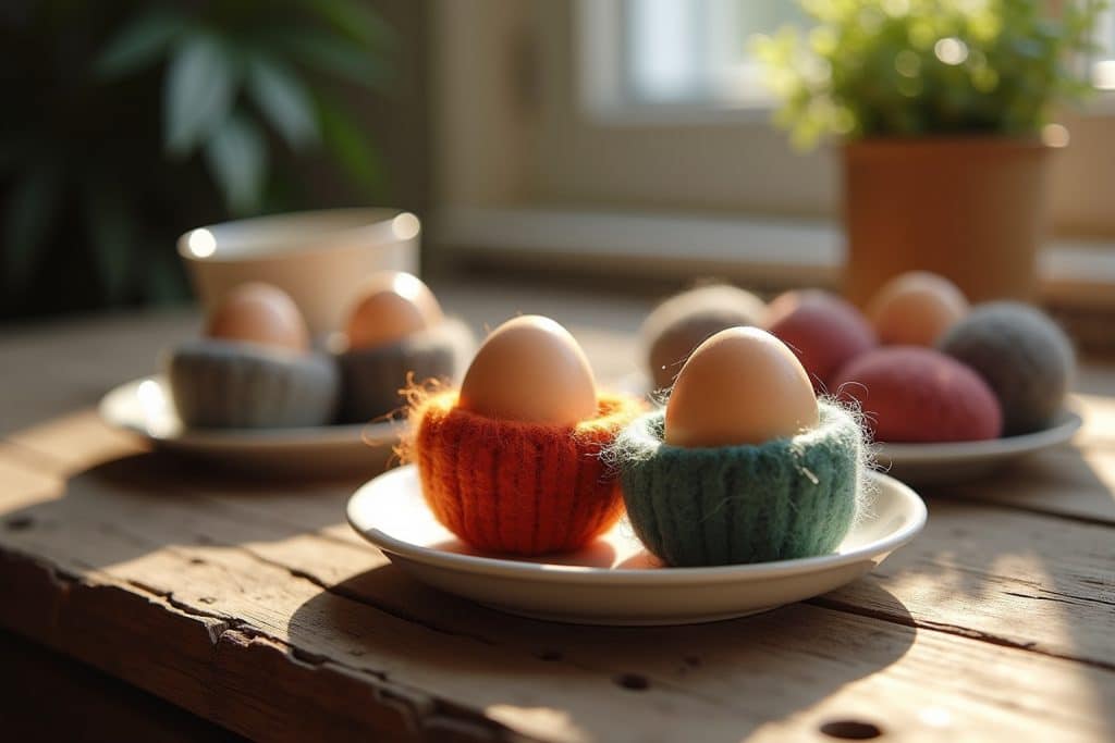 - Eierwärmer mit Gesicht: Filze lustige Gesichter auf deine Eierwärmer und bringe deine Familie zum Lachen.
