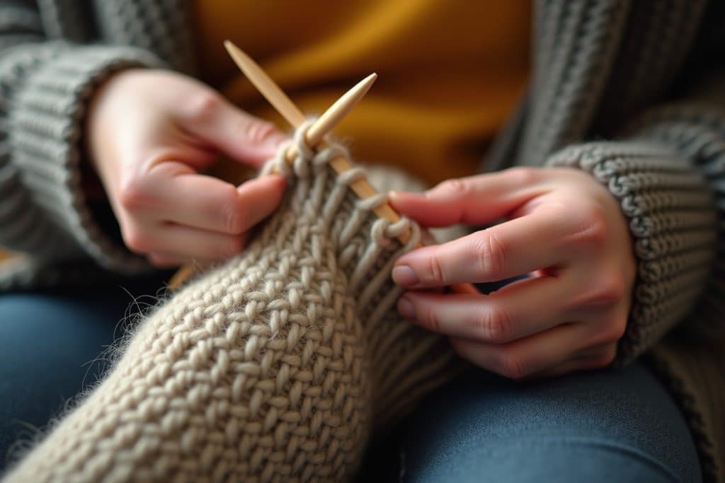 Wiederhole diese beiden Reihen abwechselnd, bis du wieder die ursprüngliche Maschenzahl erreicht hast. Achte darauf, dass du die aufgenommenen Maschen gleichmäßig verteilst, um unschöne Löcher zu vermeiden. Du kannst die aufgenommenen Maschen auch verschränkt abstricken, um ein dichteres Maschenbild zu erhalten.